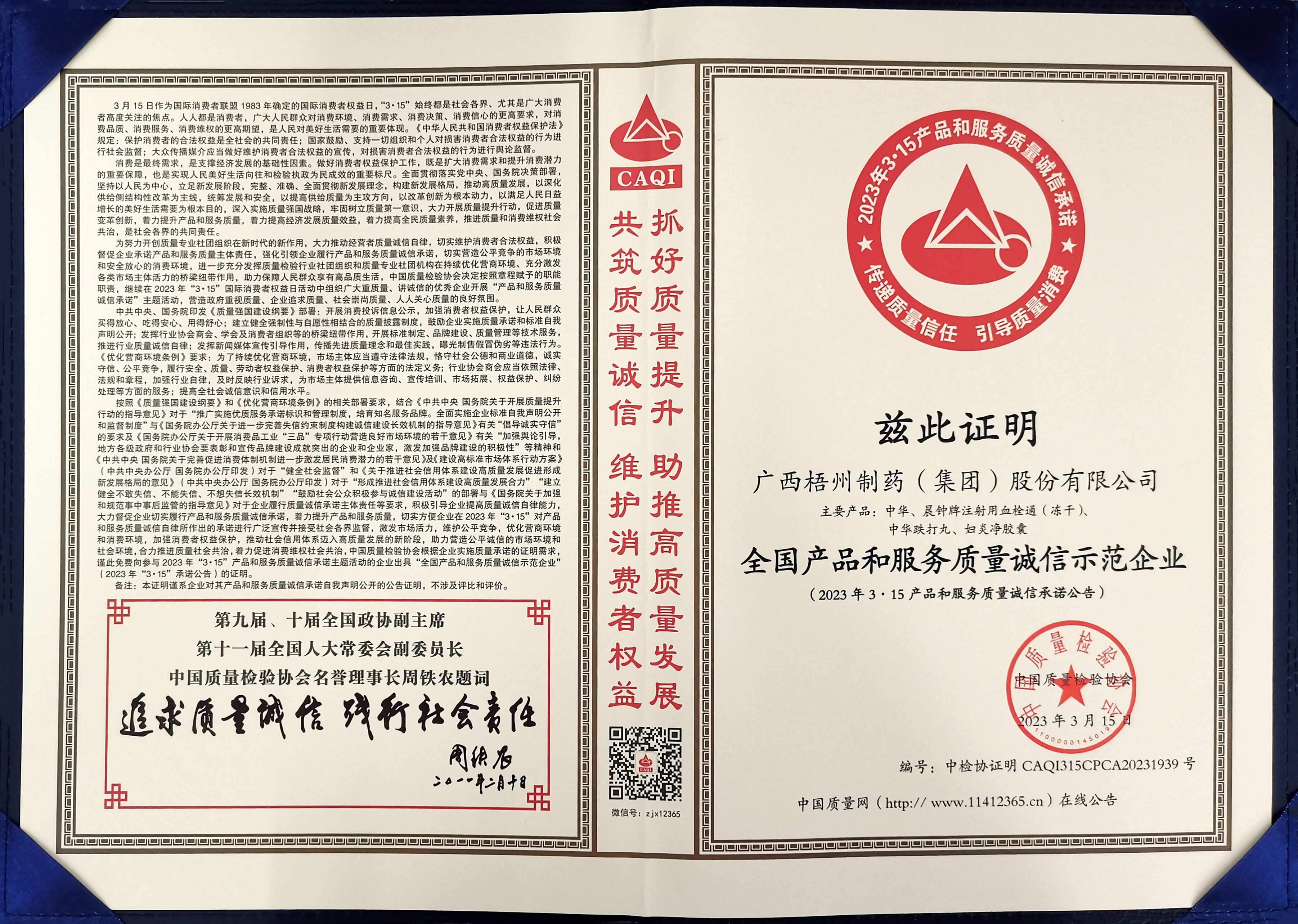 廣西梧州制藥(集團)股份有限公司榮獲2023年全國產(chǎn)品和服務(wù)質(zhì)量誠信示范企業(yè)