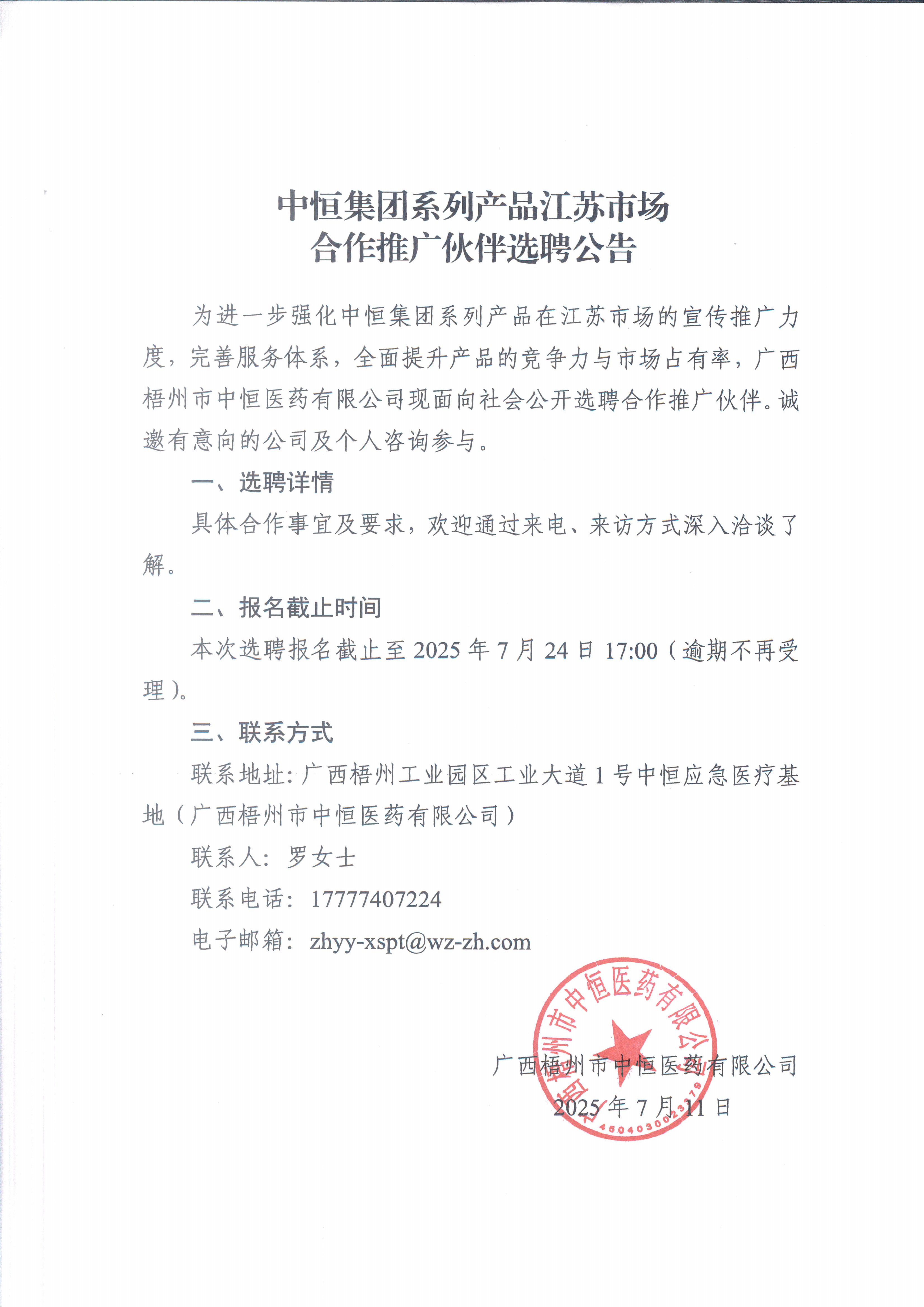 中恒集團(tuán)系列產(chǎn)品江蘇市場合作推廣伙伴選聘公告